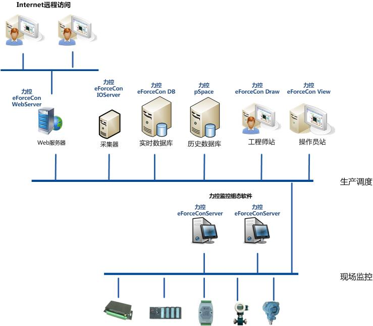 平臺采用分布式結(jié)構(gòu)部署,支持B/S結(jié)構(gòu),可擴展C/S模式,與現(xiàn)場子系統(tǒng)可通過底層PLC驅(qū)動或者OPC無縫連接,以達到良好的實時性與可靠性。