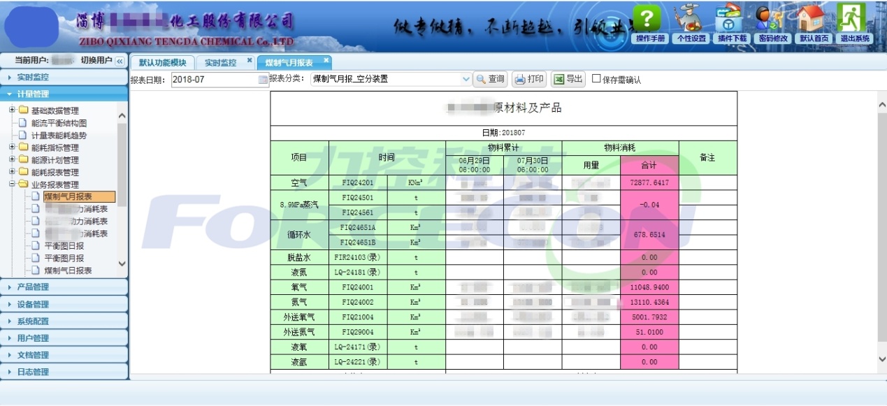 系統匯總自動采集的能源計量數據和手工補充錄入的能源計量數據,針對單個耗能裝置或耗能考核單元,基于能源平衡模型按同類能源介質進行能源供給、消耗、損耗的平衡計算,生成能源統計系列報表。統計項包括:各種能源介質的采購量、自產量、消耗量、銷售量、損失量等信息。