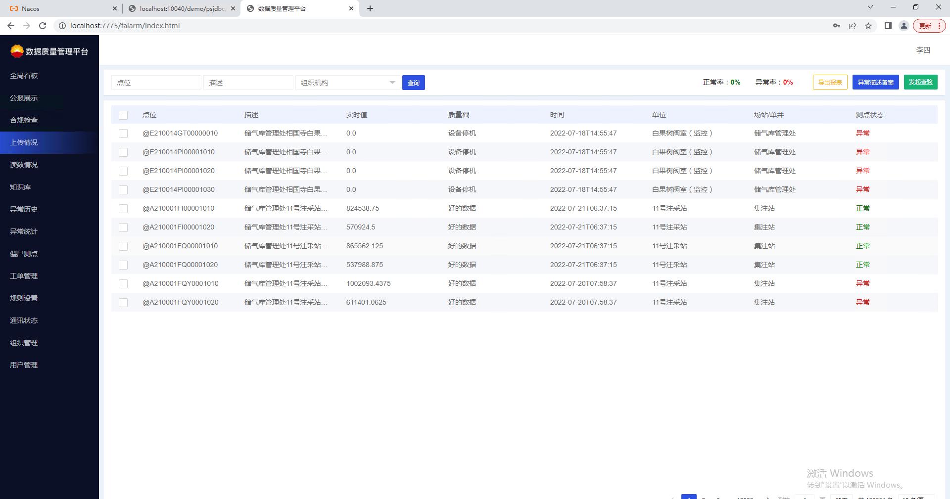 上傳情況上顯示當天新增測點的情況,按照創建的時間進行排序,最近的創建靠在最前面。 “上傳情況”包含對每個點異常情況進行統計,默認展示當天的異常統計情況,能查詢某段時間異常查詢的功能。在左上角查詢條件處包含“點位”、“描述”、“組織機構”查詢出我們需要的點; “測點狀態”查詢,可對“正常”和“異常”數據點進行區分,對異常數據點可以一鍵實現“異常測點備案”和“發起查驗”操作。