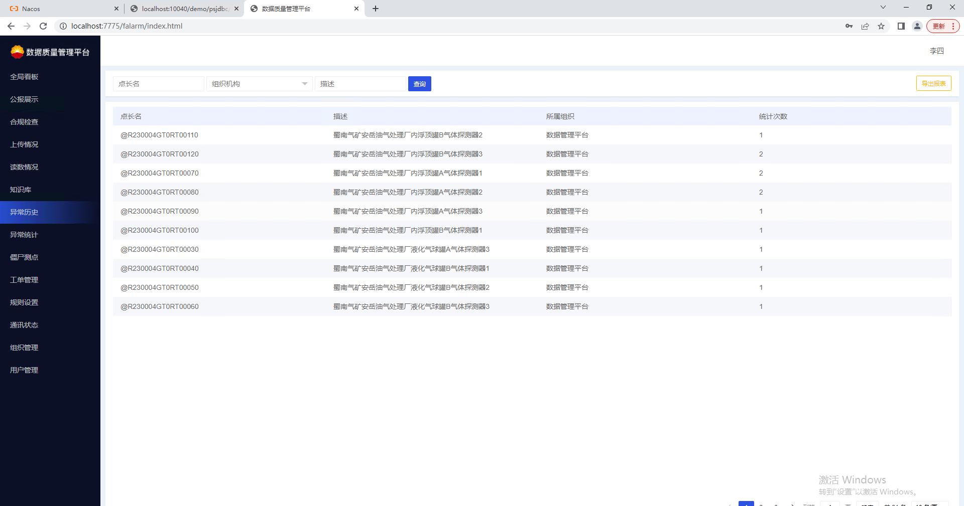 異常歷史與知識庫相綁定,將異常的點名、描述、所屬組織顯示到界面上,并統計了該異常測點備案的次數。