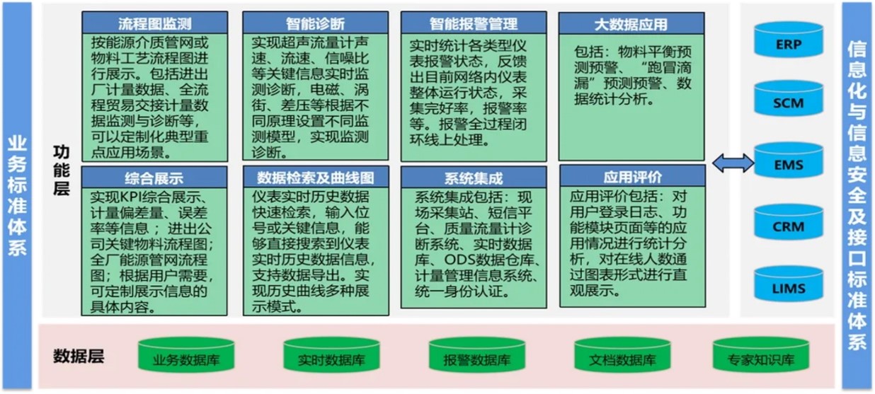 ? 結合大數據算法,實現計量KPI指標實時運算,公司級能源管網檢測率監測診斷,物料主輔數據實時比對分析等,為生產經營提供更加及時精準的計量數據。