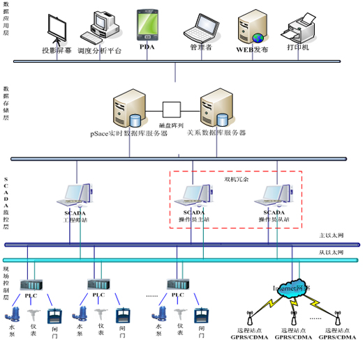 系統(tǒng)可分為四個層次,第一層為現(xiàn)場控制層,主要包括現(xiàn)場硬件PLC、儀表等設備;第二層為SCADA監(jiān)控層,包括中控室SCADA工程師站和操作員站;第三層為數(shù)據(jù)存儲層,主要包括工業(yè)歷史數(shù)據(jù)庫服務器;第四層是數(shù)據(jù)應用層,主要包括調度分析平臺、web發(fā)布服務器、大屏幕展示系統(tǒng)等。