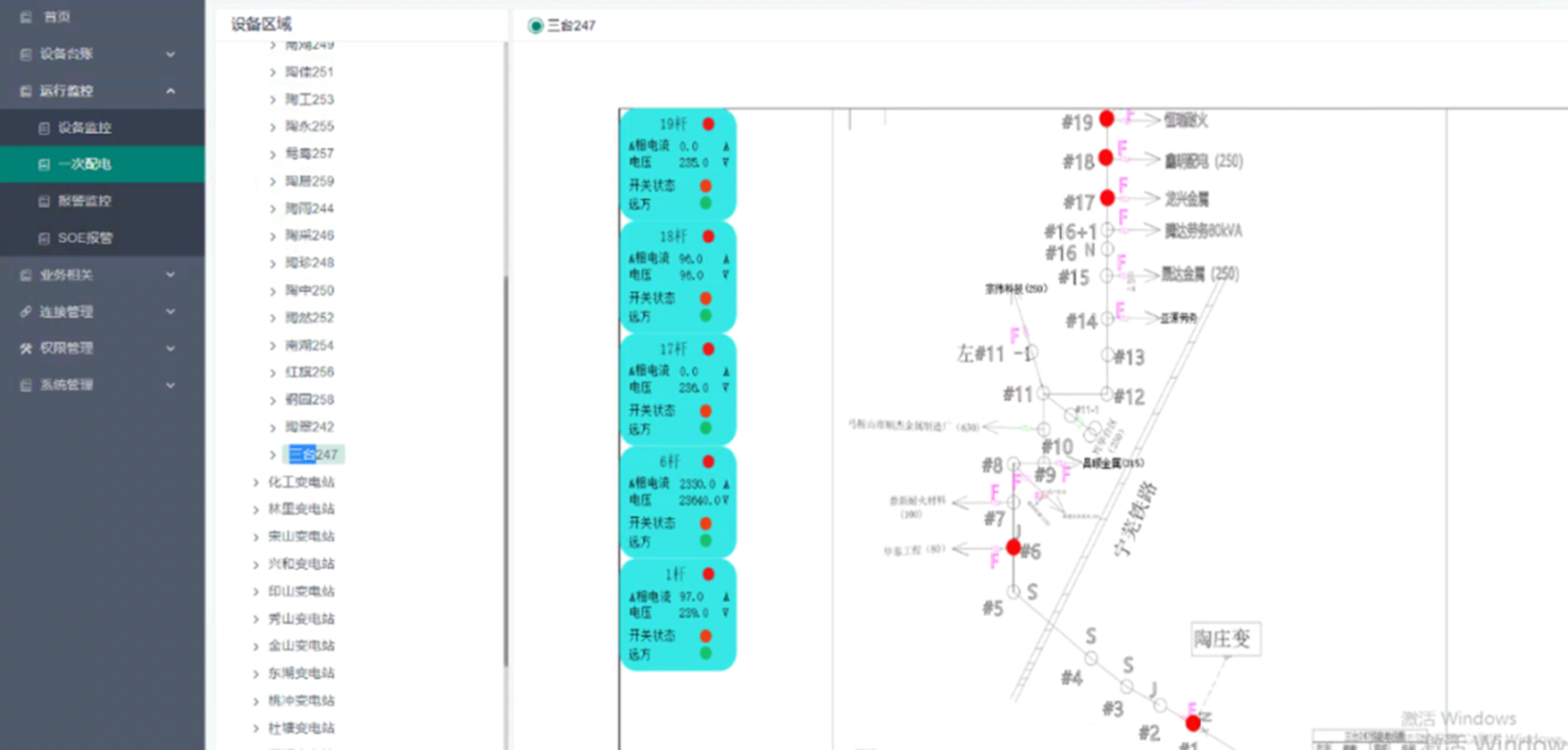 關聯(lián)大屏可視化制作的一次圖,集中監(jiān)控整條線路中所有設備的實時狀態(tài)、實時數(shù)據(jù)。頁面支持放大、縮小功能,可更加直觀的了解現(xiàn)場設備、線路的情況。