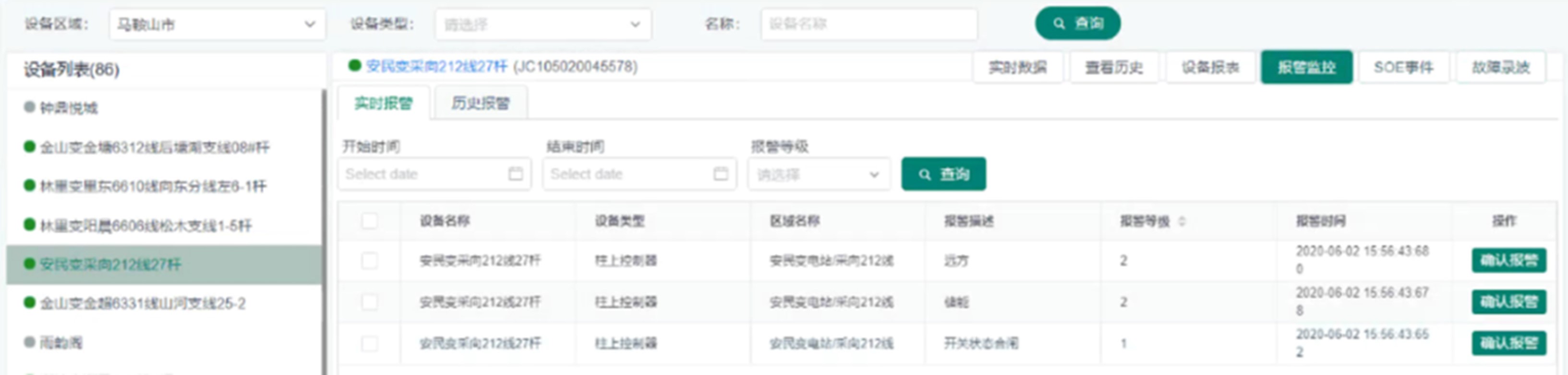 設備報警分為實時報警和歷史報警,已經(jīng)恢復的報警將進入歷史報警界面。提供報警確認處理功能,可上傳圖片、音頻、可填寫確認內(nèi)容。