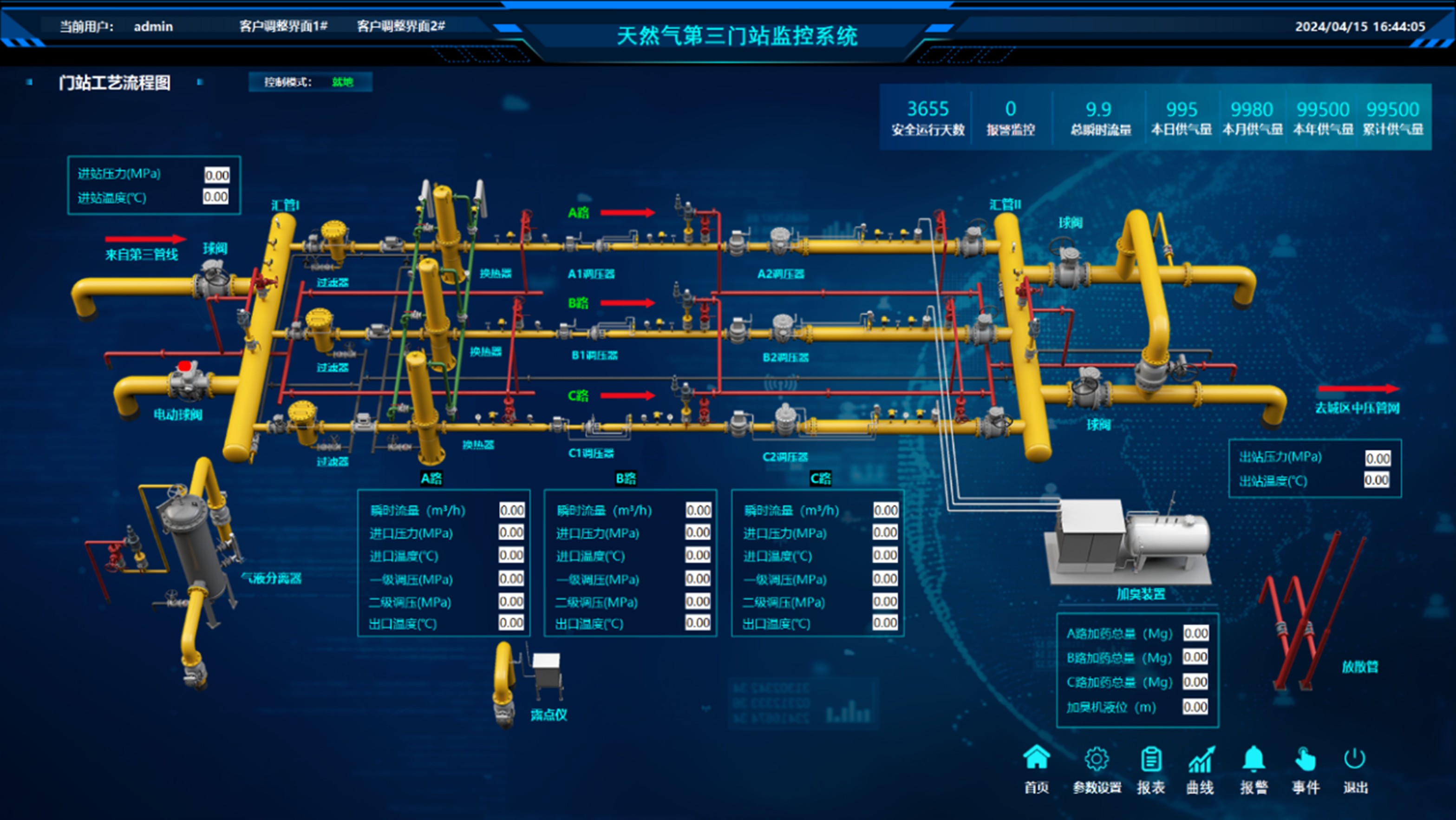 力控天然氣場站綜合管理系統的全流程工藝監控,可直觀展示場站設備布局與實時運行狀態,支持動態更新壓力、溫度、流量、瞬時值、累積值、計劃值等關鍵參數,顏色變化與動態移動效果可直觀反映異常波動。