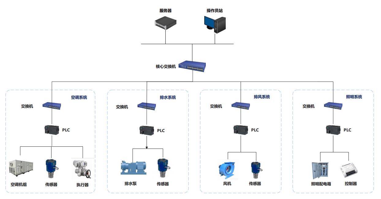 基于力控SCADA進(jìn)行設(shè)計的樓宇自控BA系統(tǒng),旨在打造一個高度集成、智能化的管理平臺,實現(xiàn)對樓宇內(nèi)各類設(shè)備的全面監(jiān)控與精準(zhǔn)控制。系統(tǒng)采用分層架構(gòu)(現(xiàn)場設(shè)備層、控制層、網(wǎng)絡(luò)層、管理層),依托穩(wěn)定可靠的網(wǎng)絡(luò)實現(xiàn)全層級數(shù)據(jù)互聯(lián)。