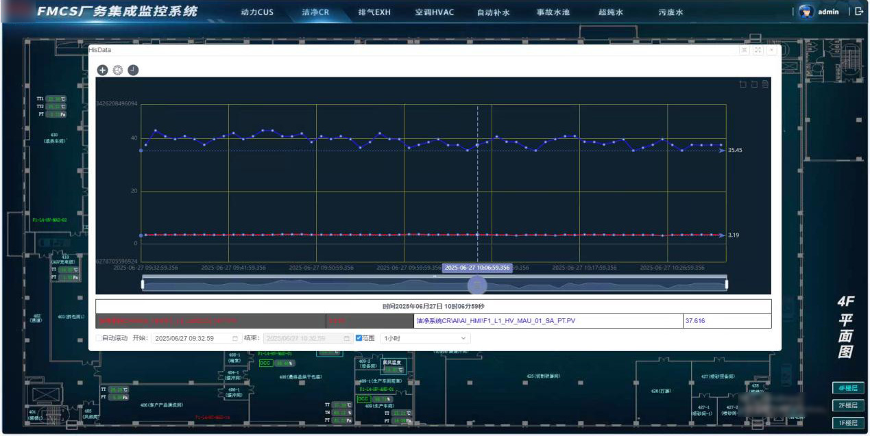 系統按動力CUS、潔凈CR、排氣EXH、空調HVAC、自動補水、事故水池、超純水、污廢水等八大子系統進行流程可視化展示,覆蓋生產工藝用水、恒溫恒濕恒壓環境控制及廢氣廢水處理等環節。實時監測運行狀態與工藝參數,優化調節PID參數,保障生產環境穩定可靠。