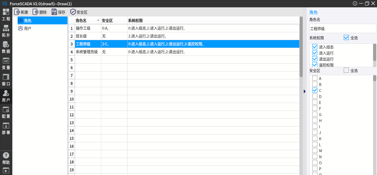 角色管理功能為現(xiàn)場提供了更加靈活和高效的權(quán)限控制方式。通過定義不同的角色,如操作工、班長、工程師、系統(tǒng)管理員等,為每個(gè)角色分配相應(yīng)的系統(tǒng)權(quán)限和安全區(qū),確保每個(gè)用戶只能執(zhí)行其職責(zé)范圍內(nèi)的操作。大大減少了誤操作的可能性,并降低了由于權(quán)限不當(dāng)導(dǎo)致的安全風(fēng)險(xiǎn)。