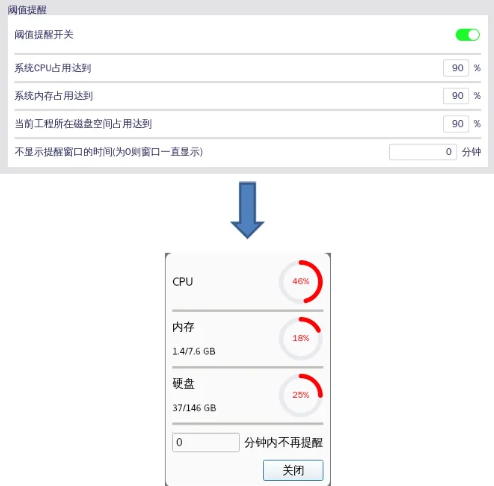 靈活配置閾值參數:精準貼合用戶實際使用需求,可以靈活配置各項參數的閾值,包括CPU使用率、內存占用率、硬盤空間等。