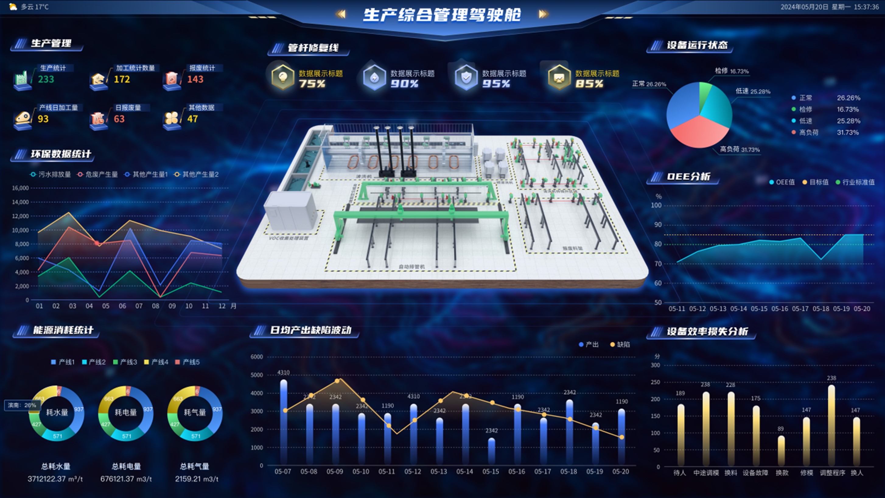 OEE計(jì)算服務(wù)能夠?qū)崿F(xiàn)可用性、性能和質(zhì)量指標(biāo)的綜合計(jì)算,形成覆蓋設(shè)備、生產(chǎn)線、車間等多層級(jí)的OEE綜合分析,運(yùn)用大屏可視化、報(bào)表和數(shù)字孿生等手段實(shí)現(xiàn)數(shù)據(jù)可視化展示。