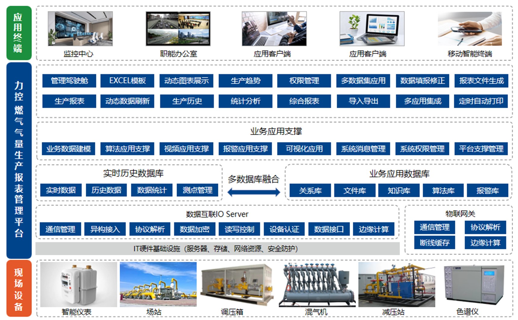 基于力控燃氣氣量生產報表管理平臺、企業實時歷史數據庫pSpace形成解決方案,功能包括資產模型的建立,場站設備臺賬生成,設備運行監控及報警處理、核查管理、智能報表等,實現天然氣氣質數據全面采集、存儲以及相關業務處理和報表統計分析。