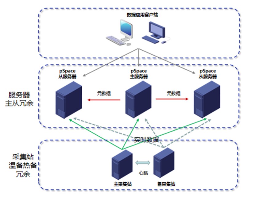 主從冗余:主服務器的元數(shù)據(jù)主動同步到從服務器,保證主從服務器工程一致性;實時數(shù)據(jù)都來自采集站,保證實時數(shù)據(jù)一致性;斷線緩存功能確保數(shù)據(jù)的完整性;采集站冗余保證采集數(shù)據(jù)不丟失。