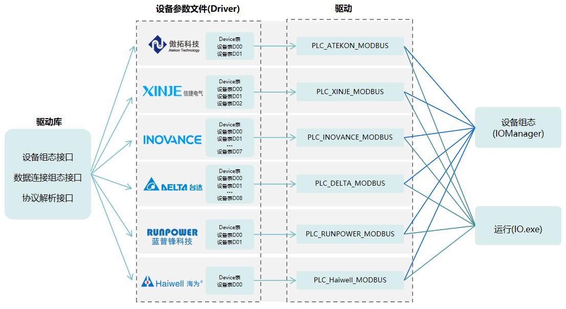 力控科技采用“公共代碼 + 配置文件”的抽象產(chǎn)品開發(fā)模式,將不同廠商PLC的通信差異通過配置文件進(jìn)行定義,代碼層則通過解析配置文件的內(nèi)容實現(xiàn)差異化處理。該模式把Modbus通信復(fù)雜的功能都封裝在代碼內(nèi)部,既節(jié)省了開發(fā)成本,又降低了工程師的使用門檻,并且實現(xiàn)國產(chǎn)PLC基于Modbus協(xié)議通信的“三快”目標(biāo):開發(fā)適配快、使用上手快、組態(tài)建點快。