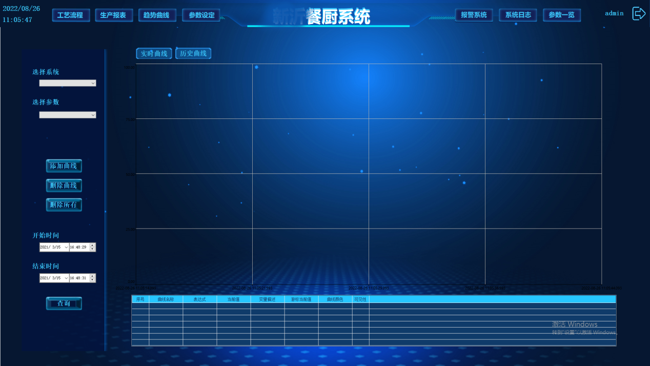 操作員可通過菜單或按鈕進入實時曲線畫面或歷史曲線畫面,可選擇需要的工藝參數查看實時曲線或歷史曲線,可同時顯示多條實時曲線,可對曲線進行放大或縮小,可任意選擇需要查看的時間段。
