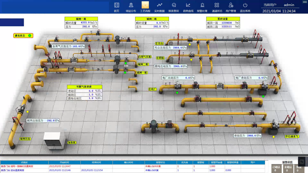 生產(chǎn)運行監(jiān)控主要借助SCADA系統(tǒng)將分布在管轄區(qū)域內(nèi)場站、閥室、調(diào)壓站、用戶、加氣站所采集的管網(wǎng)設(shè)備的運行參數(shù)匯集上來,從而掌握整個管網(wǎng)的運行情況,并對運行設(shè)備進行實時監(jiān)控。系統(tǒng)出入口采用GIS地圖和場站檢索組合方式,可通過地圖查看也可通過搜索進入該場站。