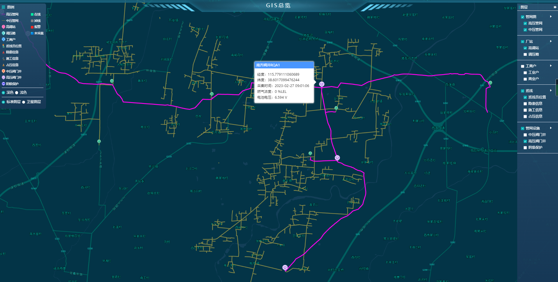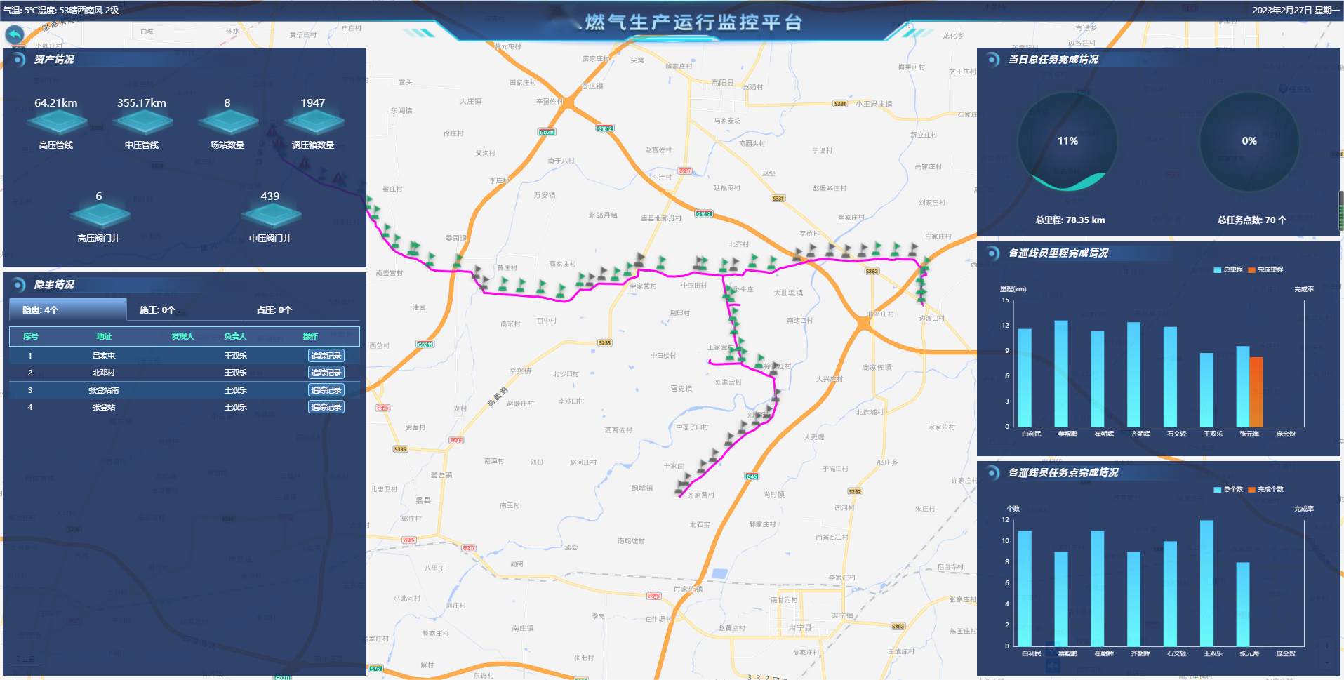 管線巡檢主要實現(xiàn)場站巡檢管理、長輸管線、城市管網(wǎng)巡線管理以及遠程交接班管理。該功能模塊主要包括路線繪制、計劃制定、計劃分配、巡線監(jiān)控、軌跡回放、隱患上報、任務(wù)統(tǒng)計分析等。